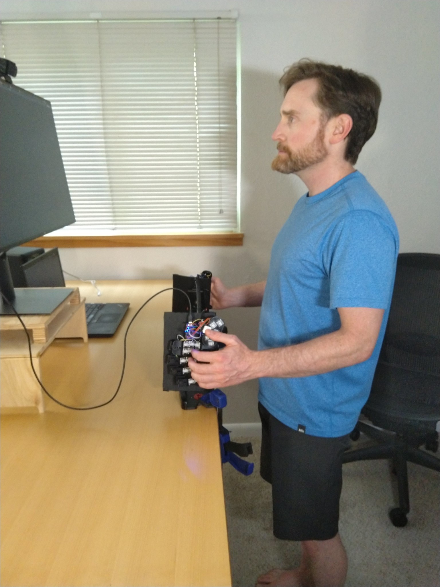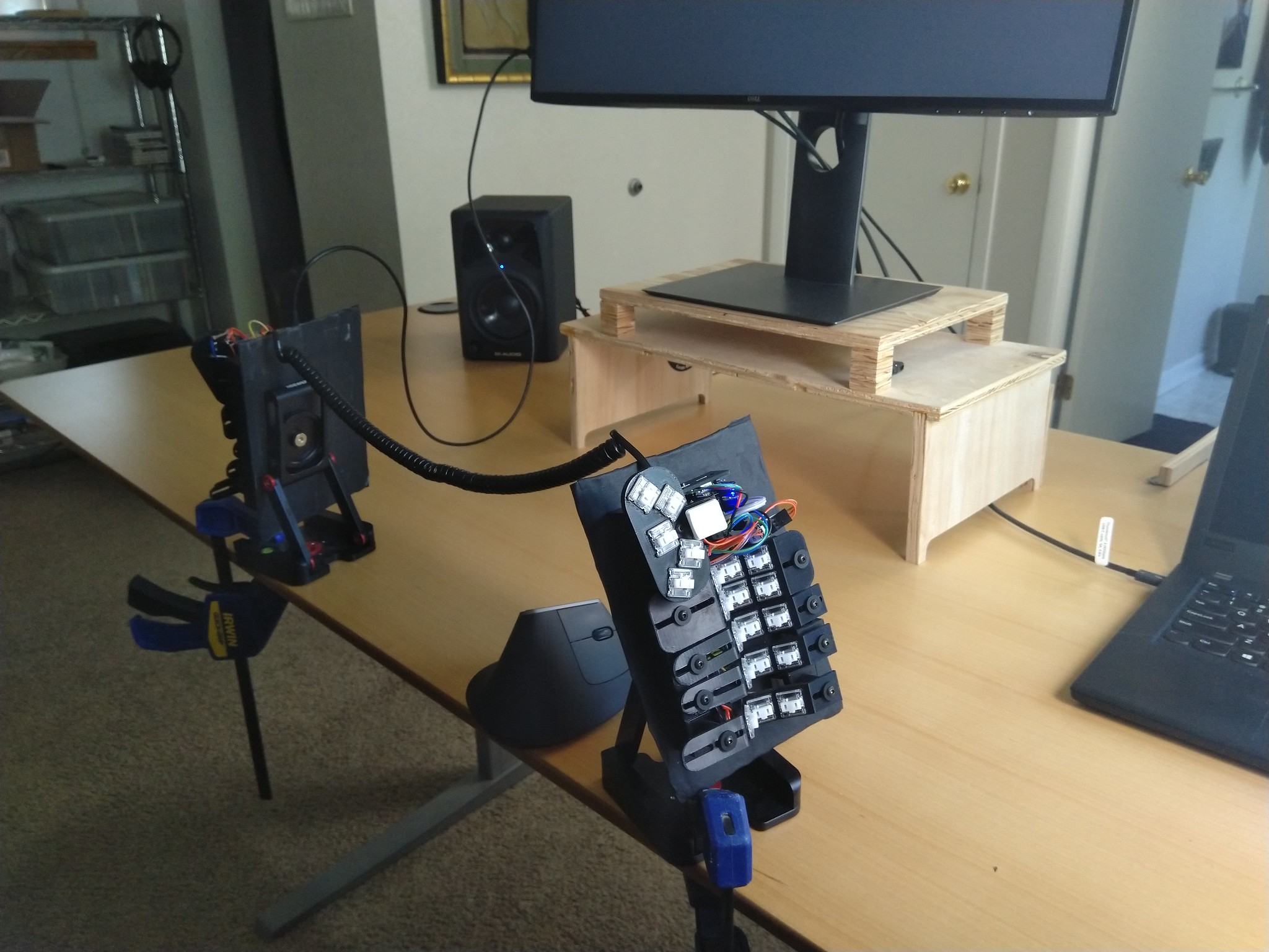 This version was completed with that same basic approach and I was either going to try to use it on my desk top or maybe mount it to the arms of my chair. But once I had the working version with the diamond-pattern metal base plate in hand, I had a eureka moment realizing I could easily and securly mount this to the camera stands I bought initially to tent my Keyboardio Model 01. That keyboard comes with a threaded insert in the base sized to match up with camera mounting gear which is absolutely brilliant. All keyboard designers take note, please. Every split keyboard should have that.