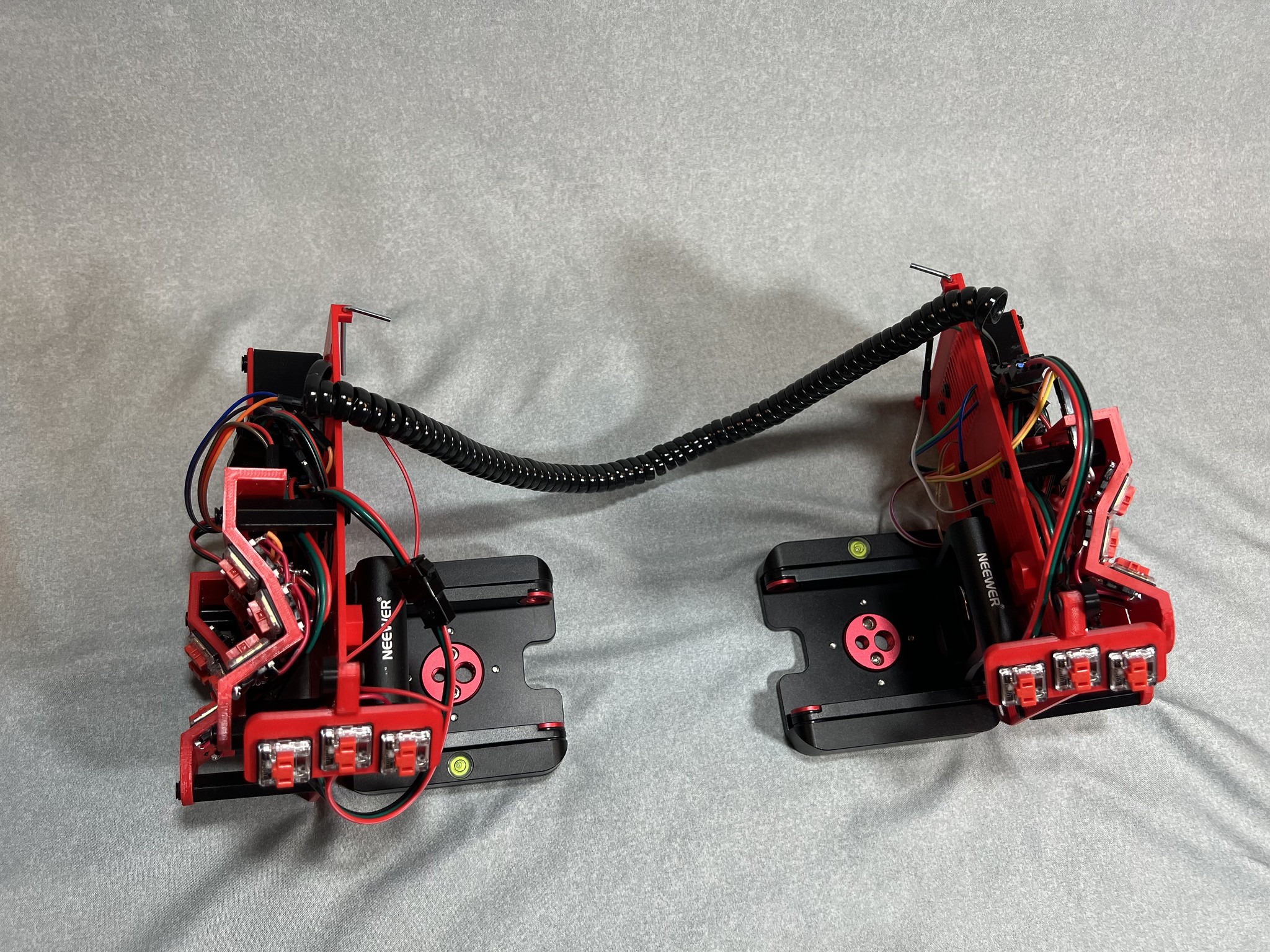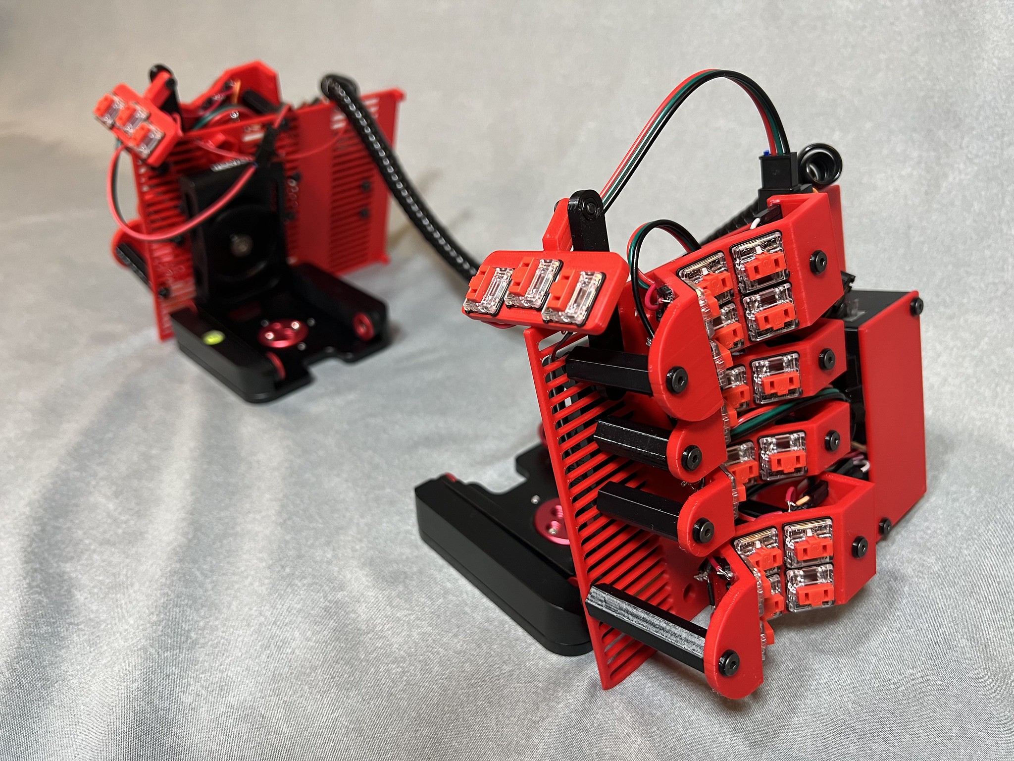 The primary mechanism of adjustment near/far has been changed to moving the finger columns along a grid of slots in the base plate, which has been custom designed and 3D printed to support this. The previous build used a steel base plate and magnets. That was kind of neat in the arbitrary precision of it and using the same mechanism for both columnar offset (near/far) and splay angle (finger columns like rays emanating from a center point vs 4 parallel lines). However, it was a bit too difficult to get everything in an optimal position and then lock it in and know it wouldn't accidentally get moved around or knocked loose.