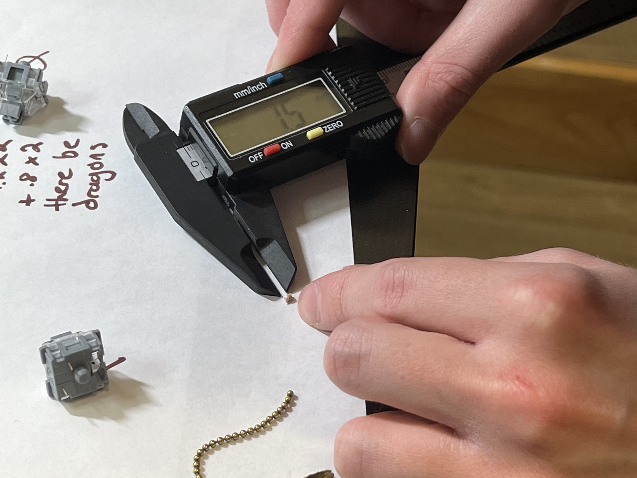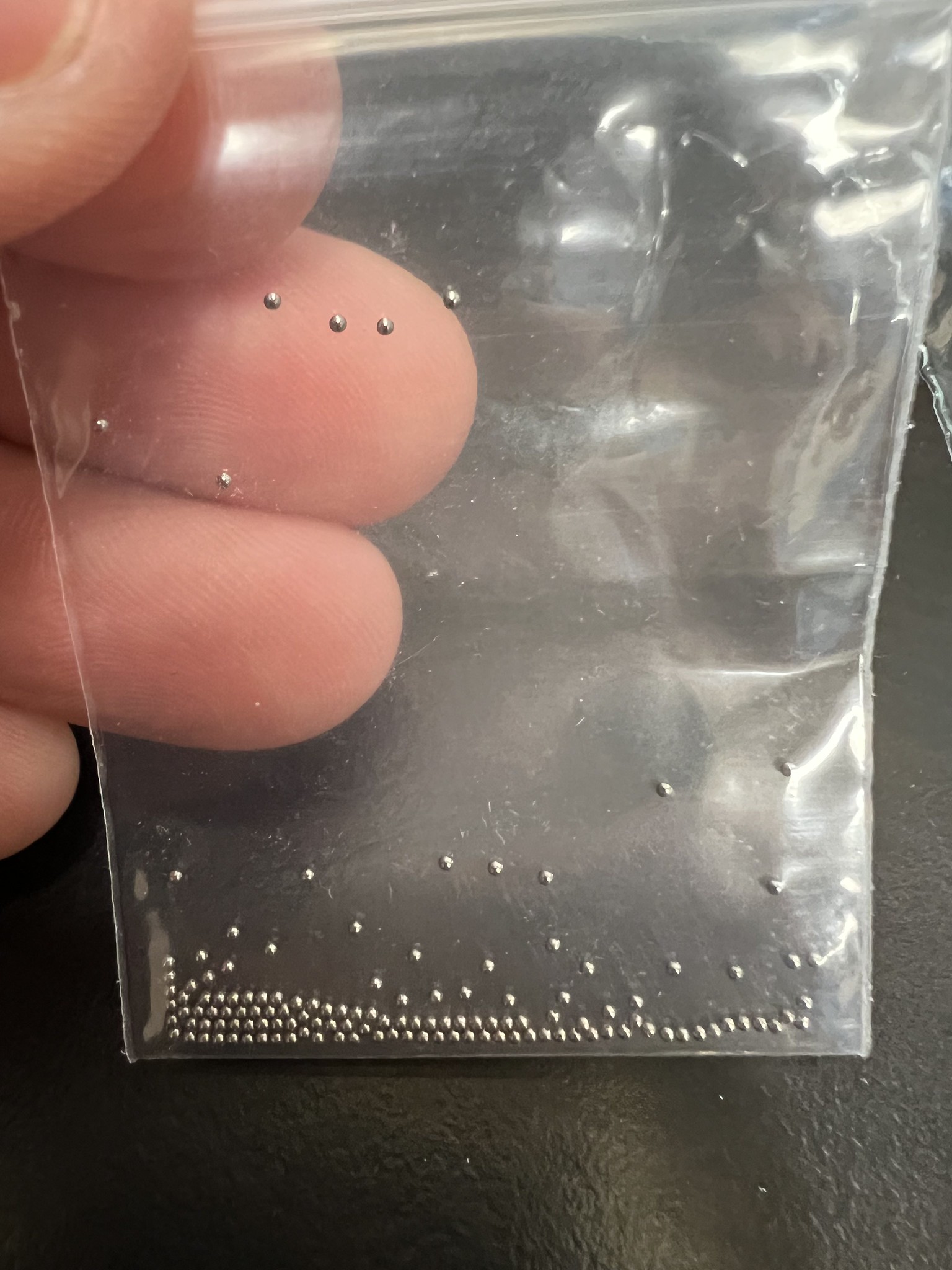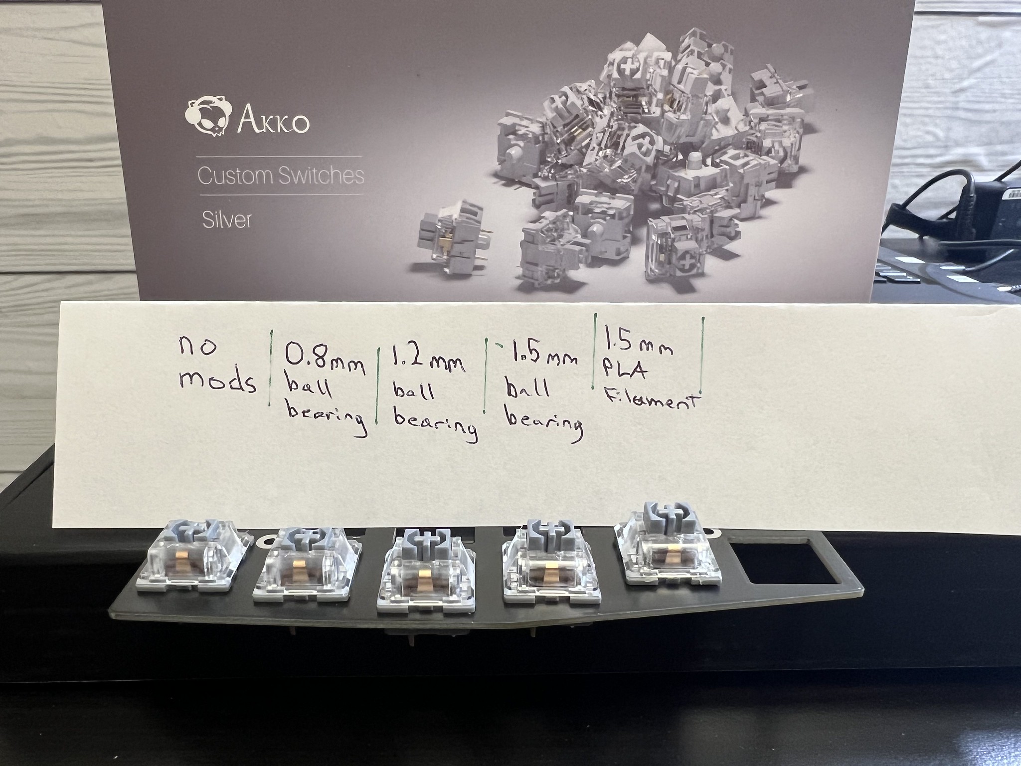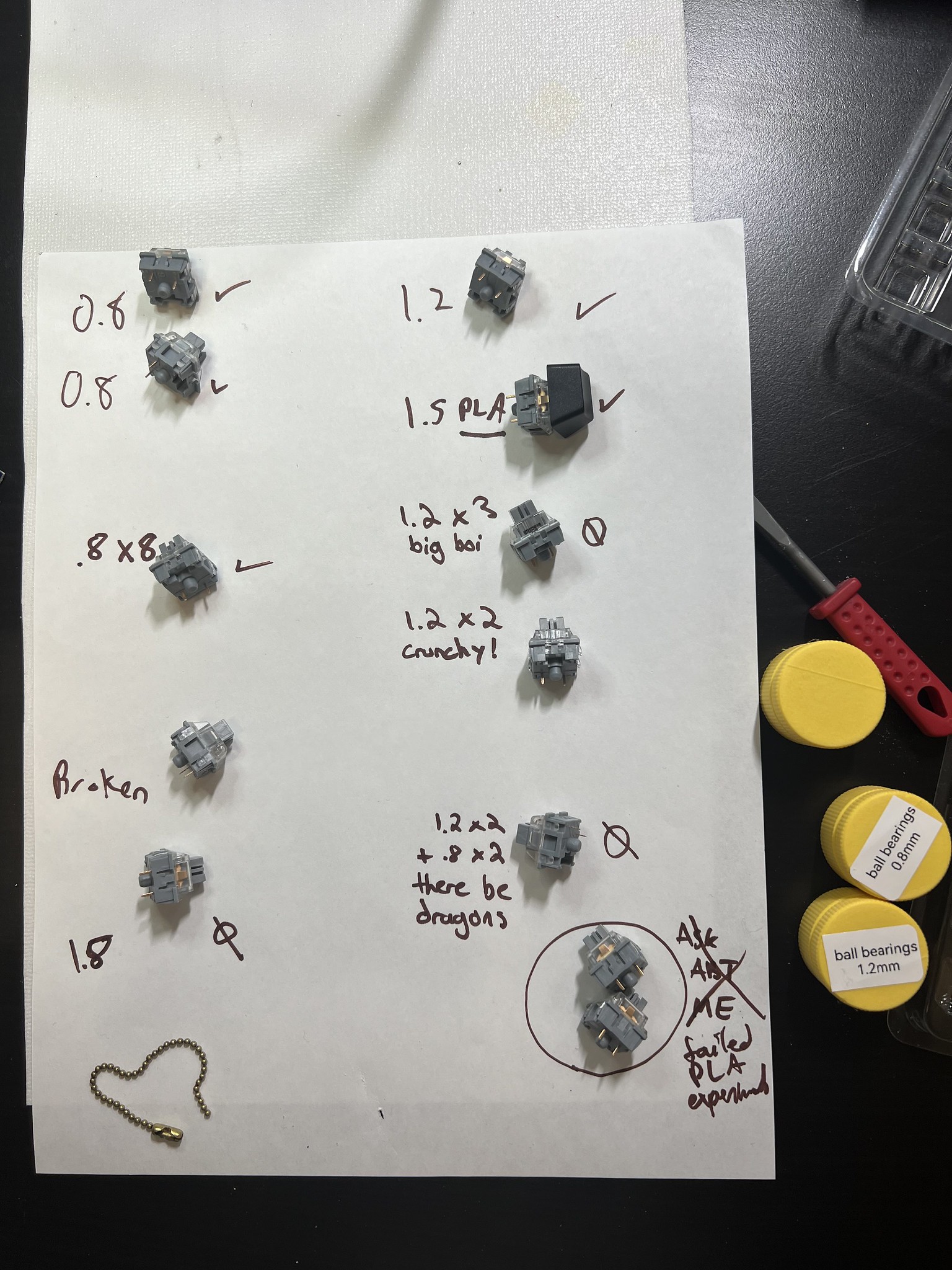We discovered you can put as many as 8 0.8mm ball bearings in the switch post and still have the switch activate. We tried all the basics and some weird things like combinations of ball bearings of different sizes. The main learning from the first session was that 1.2mm still activated the switch (* footnote spoiler read ahead), so we decided to proceed and order 1.5mm ball bearings even though the original post we were studying said it was too large. Maybe because these akko CS silver switches have a high activation point our were still activating?