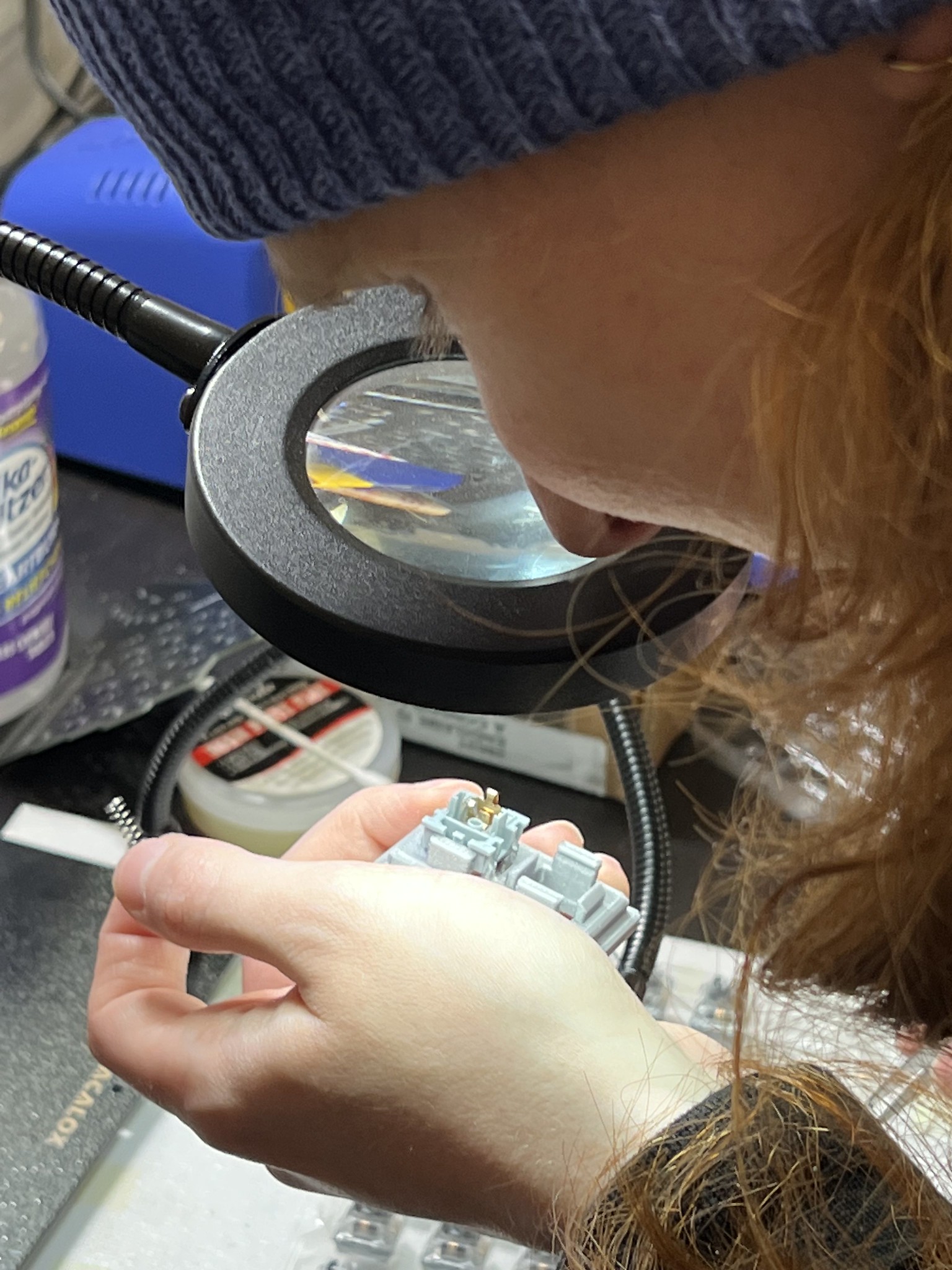 AC went into production line mode opening switches and preparing to work through a full batch of 18 switches, but I insisted we do a round of careful tests first. It turned out to be the right approach because as we tested, we easily found clear double-press misfires with sometimes as much as like 5% probability. So we kind of panicked a bit and soldered I think 3 total switches in: one stock with no modifications, one with a 1.2mm ball bearing, and one with a 1.5mm ball bearing.