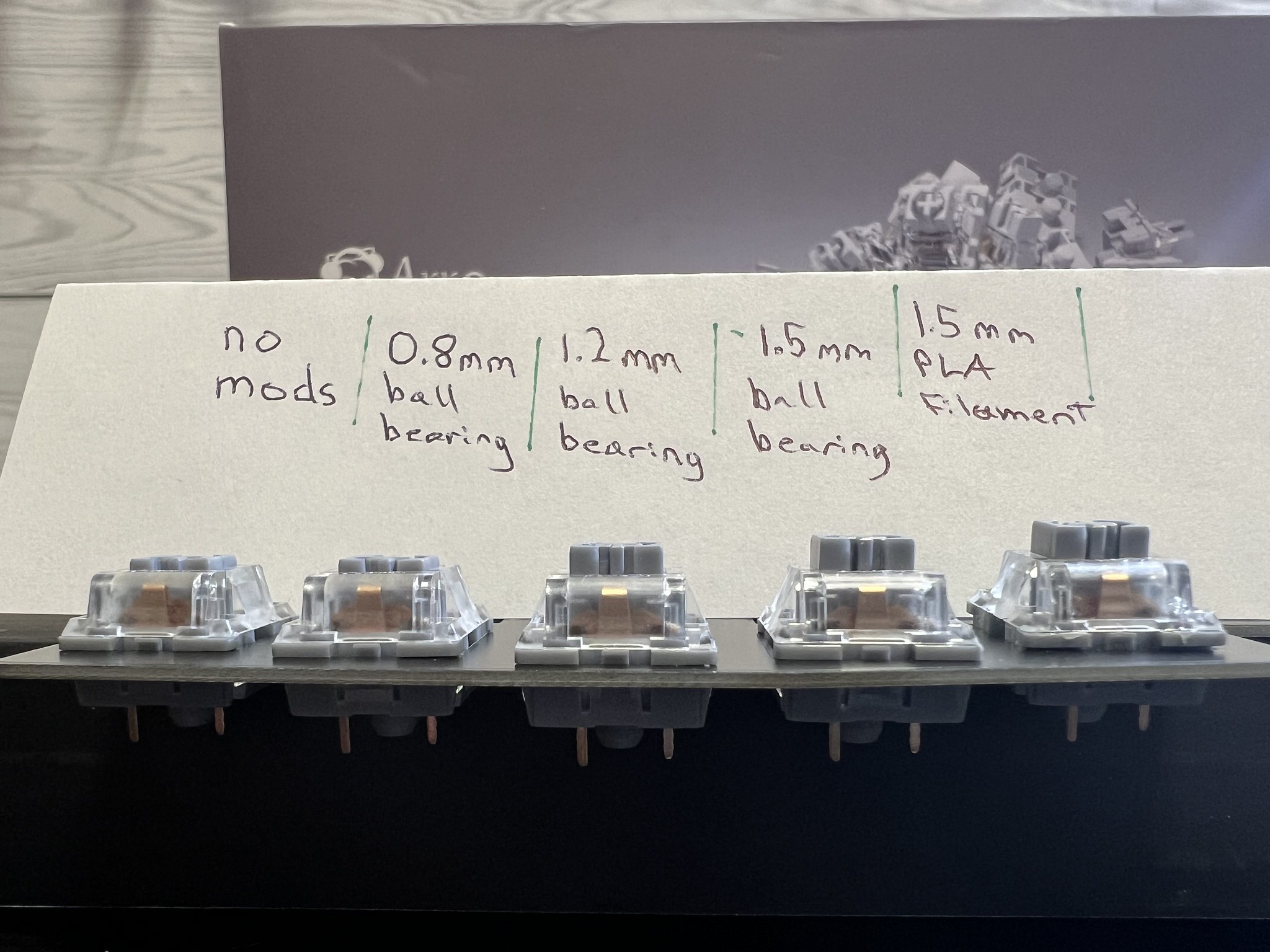 In discord discussions around my fruitless quest for low-travel switches, folks pointed me to both o-rings as a possible mod as well as the ball bearing mod.