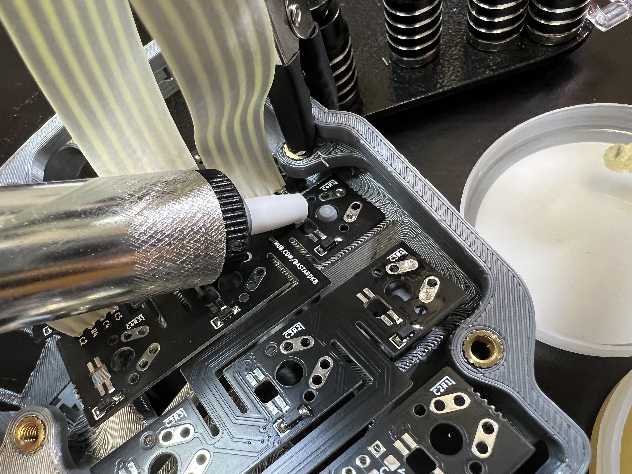 When I went to attach the bottom plate, I had another sad trombone moment when I realized I had soldered the ribbon cables to the wrong side of the MCU PCB. I think the electronic connections are still right because the legends lined up, but there's also a chance that the wiring matrix is now messed up and I'll have to adjust the firmware to compensate for that. But in the end, I just bent the ribbon cables a bit closer to the PCB and a bit sharper of an angle than is probably ideal, but the case does now fit and doesn't bulge out at that spot. I could try to fix this before finishing the other half but I think it'll be easier to manage if both halves are symmetric. Plus, I did probably my best ever soldering job on this project and I don't want to mess that up with a bunch of desoldering and resoldering on the ribbon cables.
