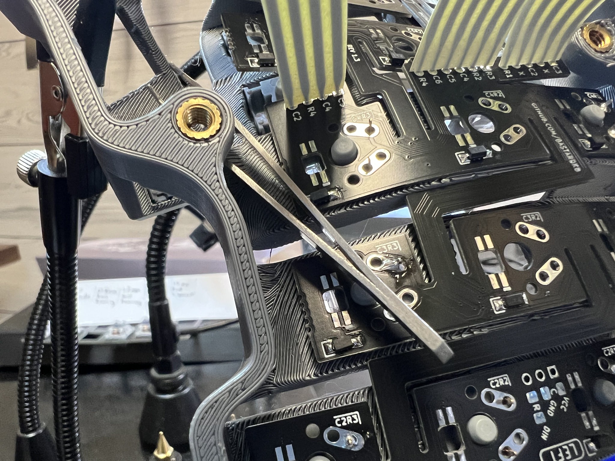 I went through and finished soldering all of the switches into both halves. When that was done I tested them and of course found that my home row index finger switch was busted, and of course accessing the underside of that one to desolder it requires removing the MCU holder again. So I undid all those bolts, managed to get the switch desoldered and slurp off the excess solder, find a switch from our stack of experiments that I could restore to unmodded operable state, and solder that into place.
