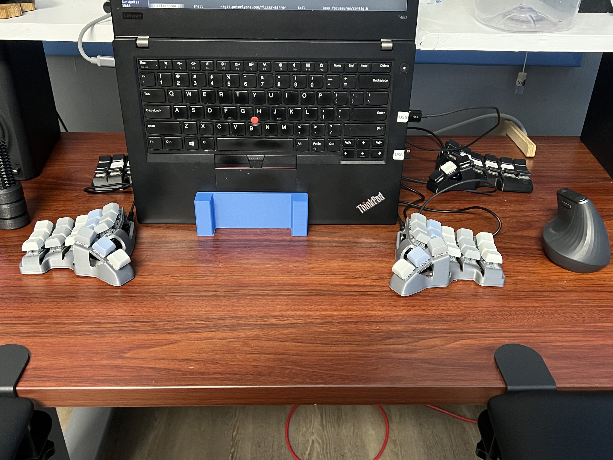 After daily driving my Keyboardio Model 100 while traveling this winter, when I got back home I was really missing QMK's combo support and the lower travel of choc switches, so I busted out the tbkmini again. It's very pleasant to type on. My only real issue with this one is I would now prefer linear switches as opposed to the brown tactiles which are in there. They are feeling quite sticky and inconsistent. The other janky part of my tbkmini is I 3D printed a small MCU holder but did not have the modeling skills to make it mount properly to the threaded inserts in the case, so instead I cut out a slot for it and glued in some terrible hacky adapters. It works fine but it's a hack job for sure.