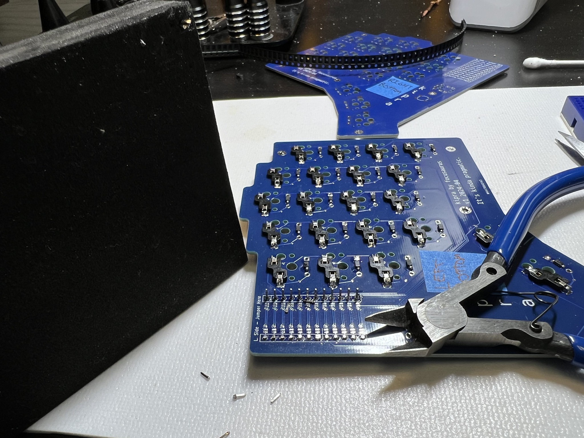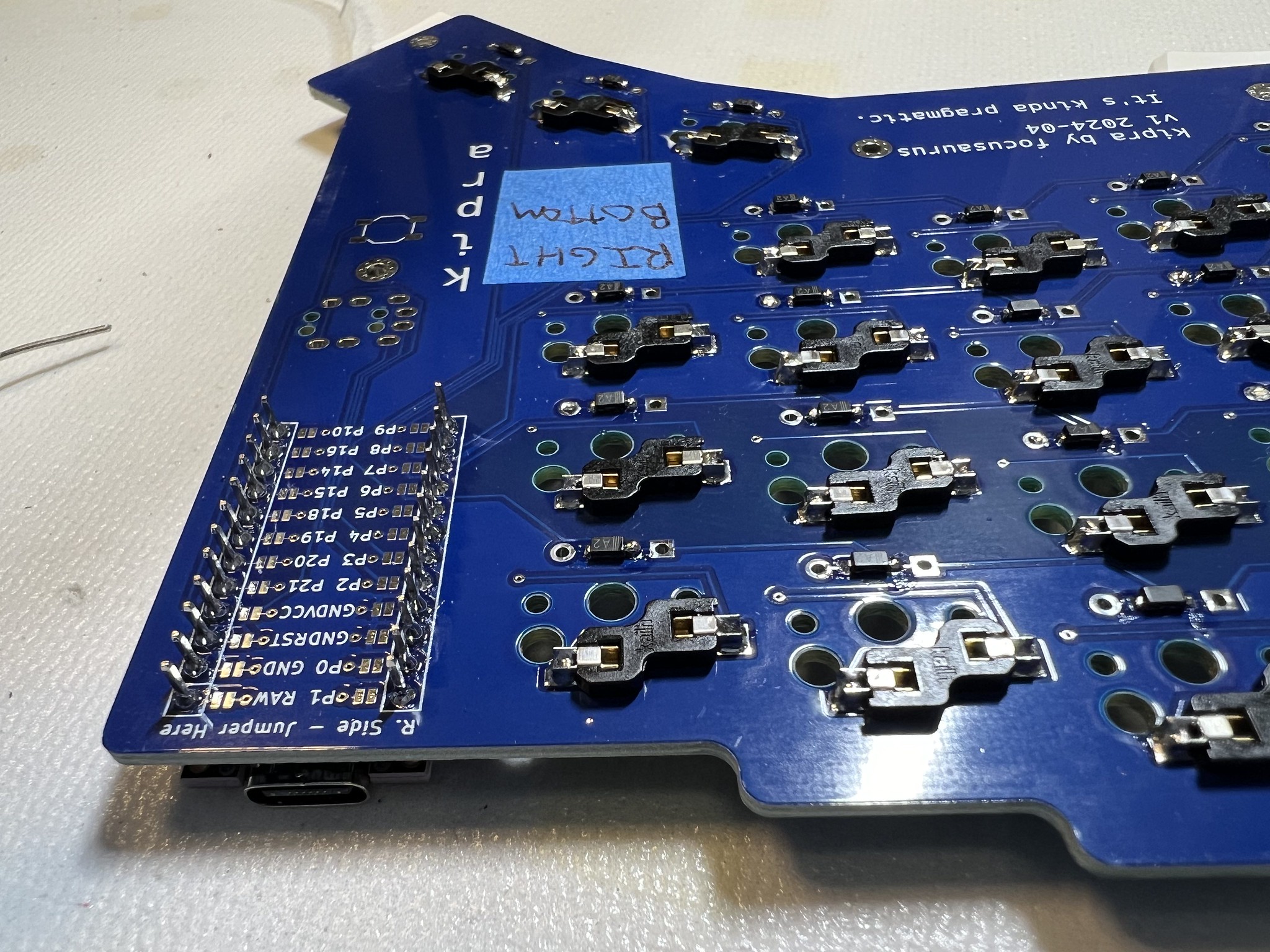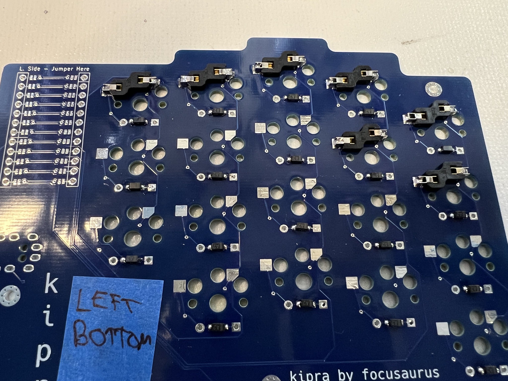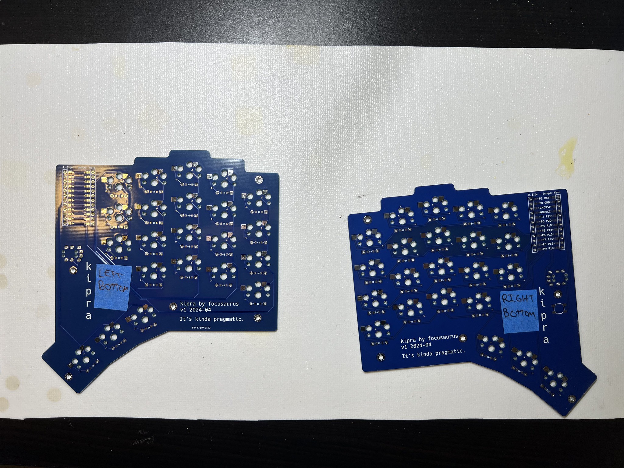 Take your PCBs, lay them out so you have a paired left and right, and put a piece of masking tape on them labeling all 4 sides: "left top", "left bottom", "right top", "right bottom". It's easy at the beginning of the build to lose track and solder something to the wrong side.