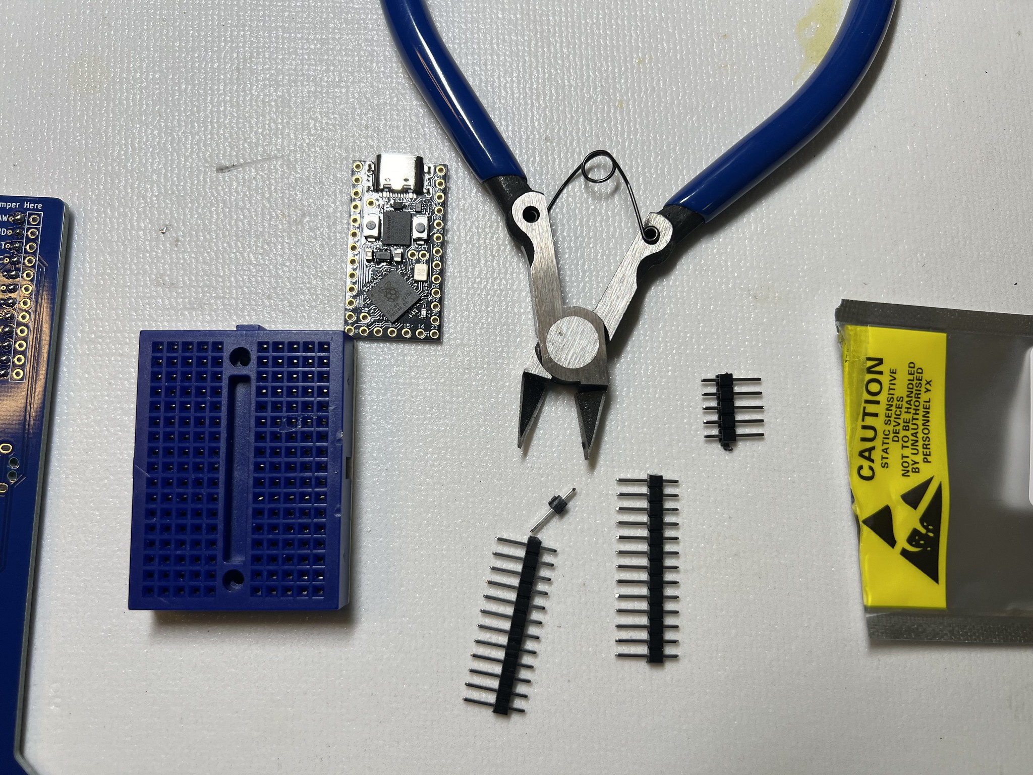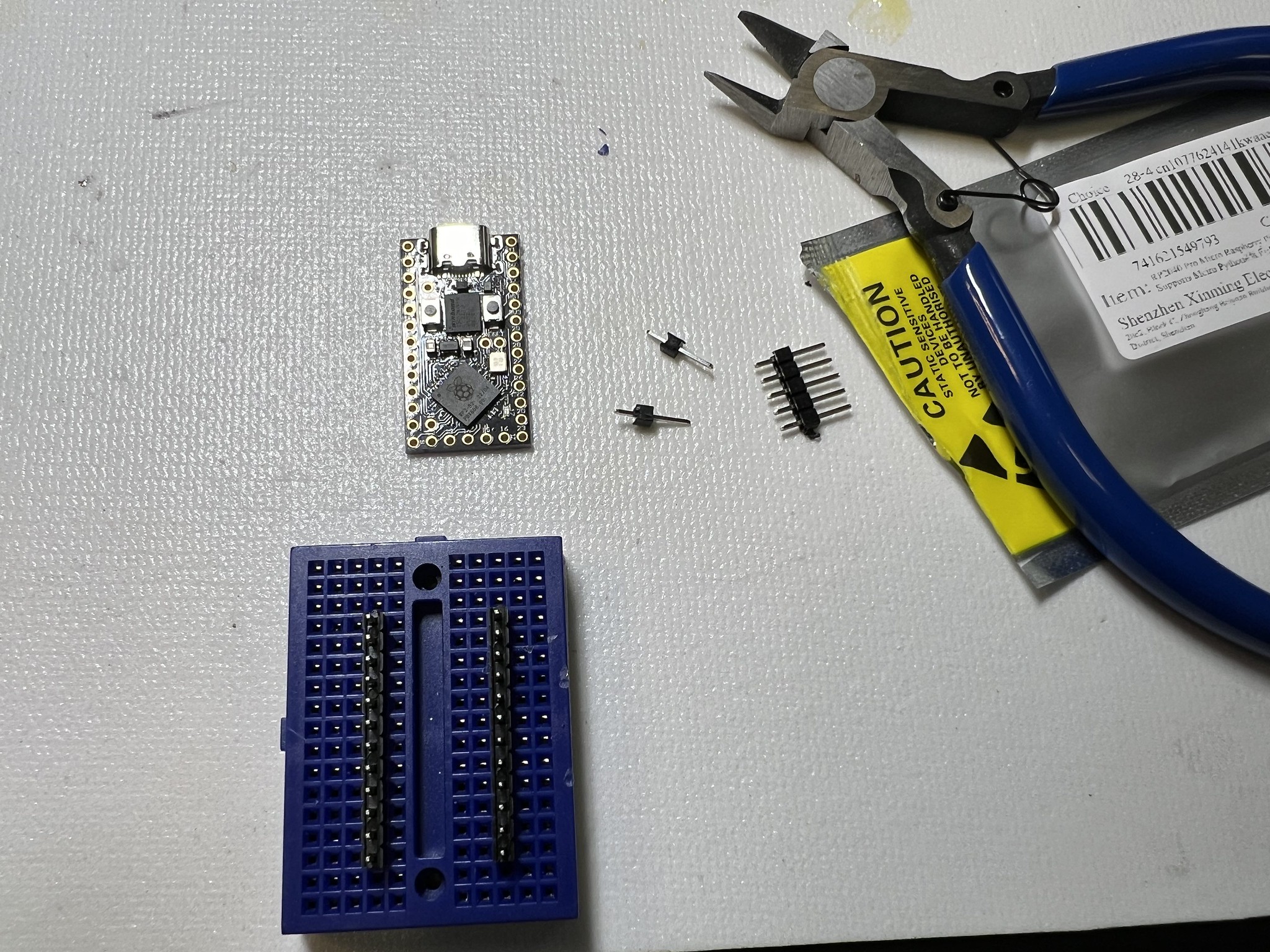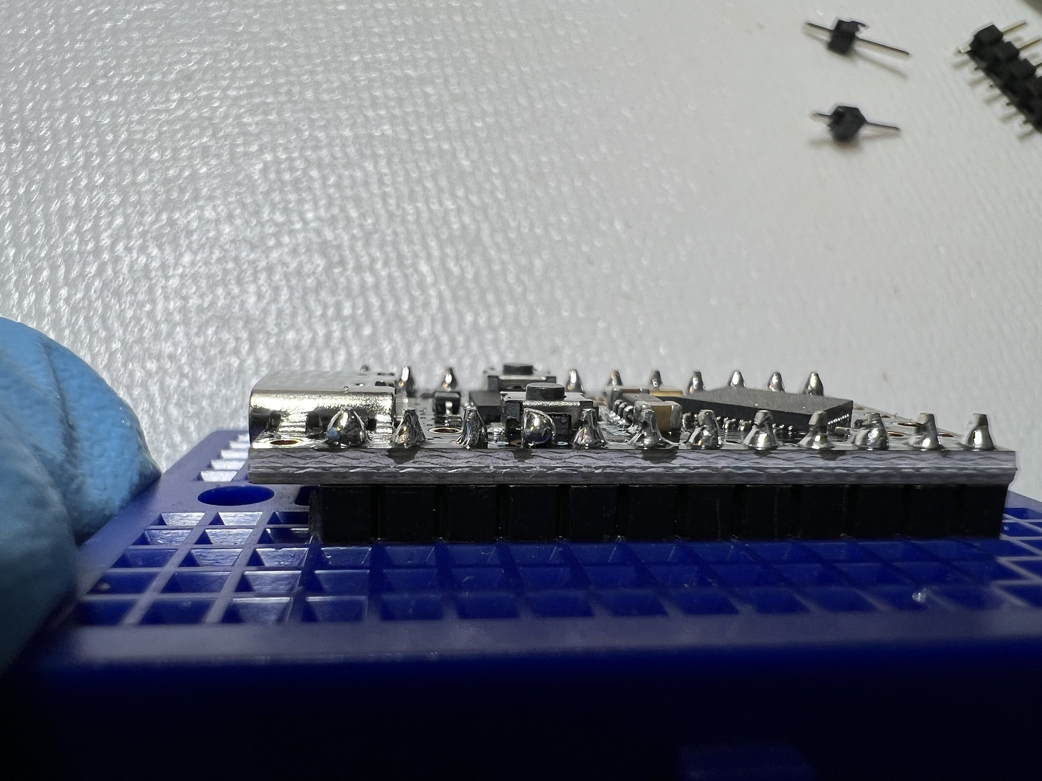 You can use socket headers if you like, but I'm not very concerned about moving my $4 MCU to another keyboard, so I just use normal pin headers. The MCU has 1 extra through hole compared to our PCB footprint, so you'll need to snip 1 pin header off the strip to have the right number.