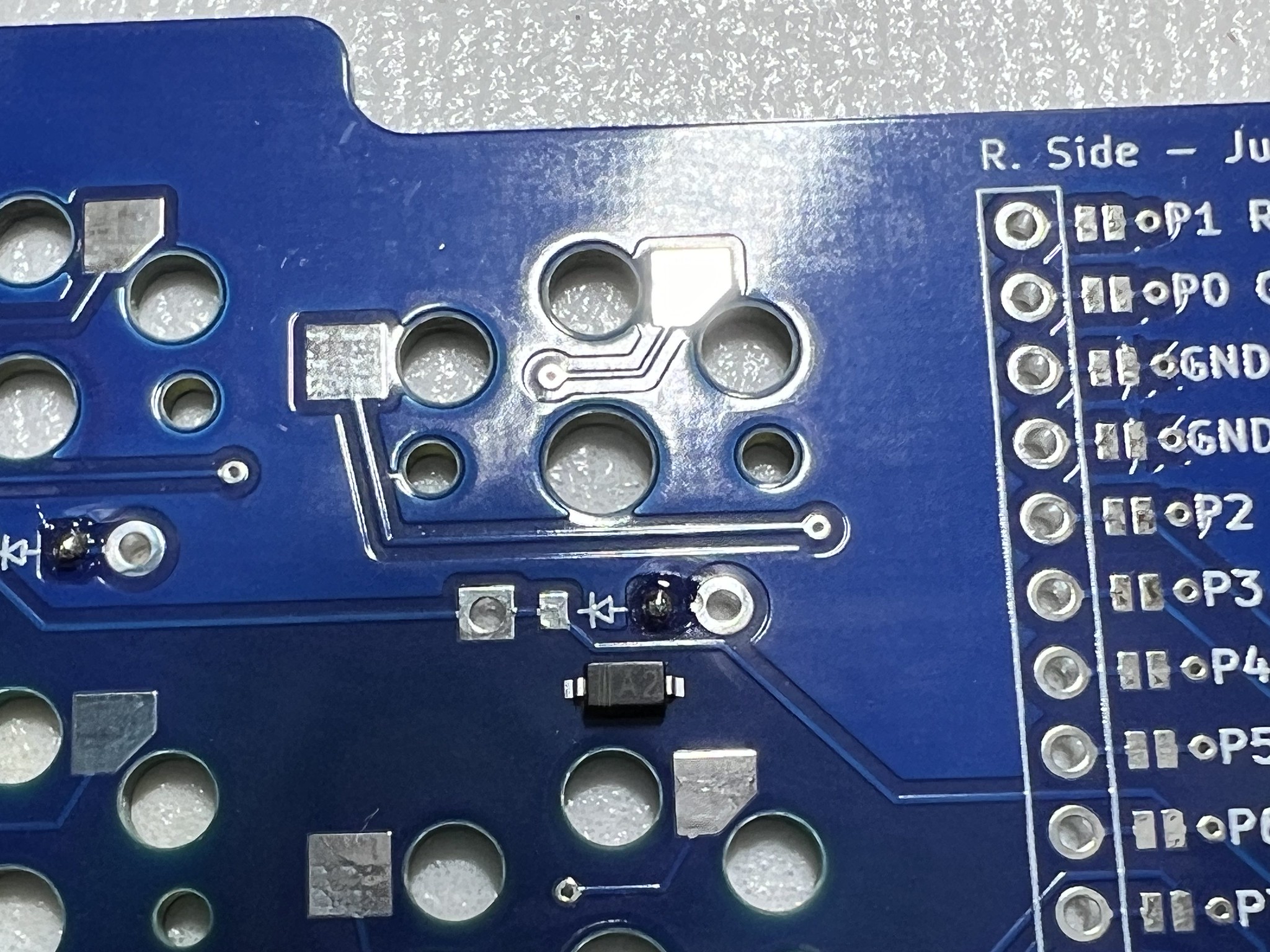 NOTE the diode orientation will feel different on the right half. Make sure you are soldering them to the right half bottom side. The diode arrows will point left which means the diode label text will likely be right side up on this half of the keyboard.