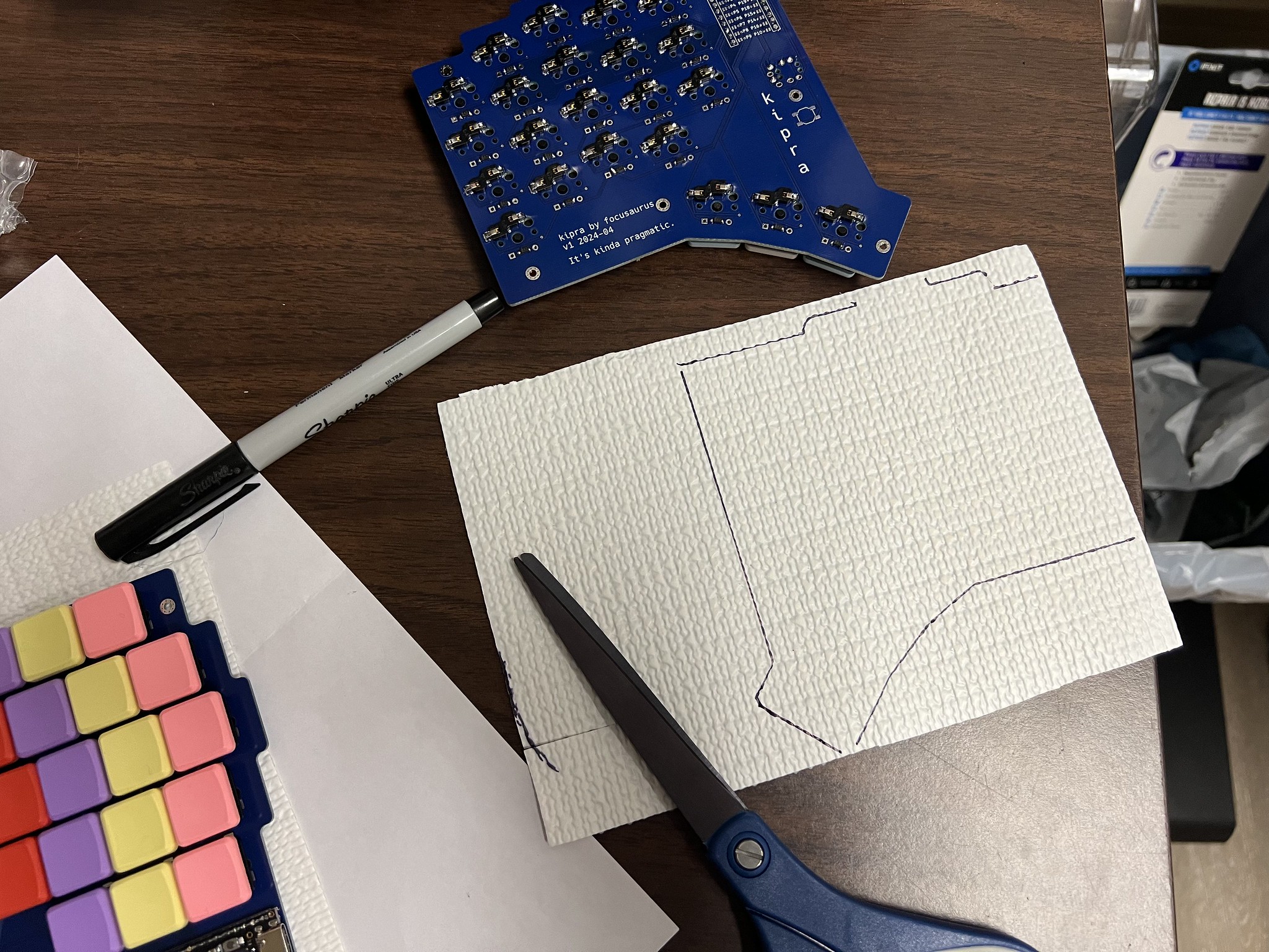 I cut my liners just a few mm smaller than the PCB shape and used some gorilla glue. I put the tiniest drop I could manage into the center of each hotswap socket, taking care not to get any glue into the actual socket. I spritzed the shelf liner with water which is how this glue says to do it. I left it with a little weight pressing it overnight to cure.