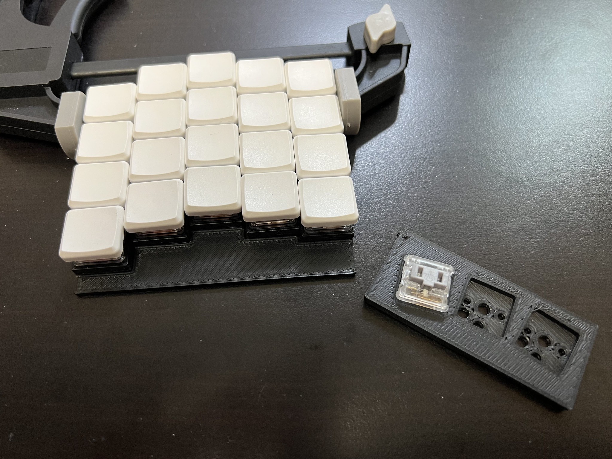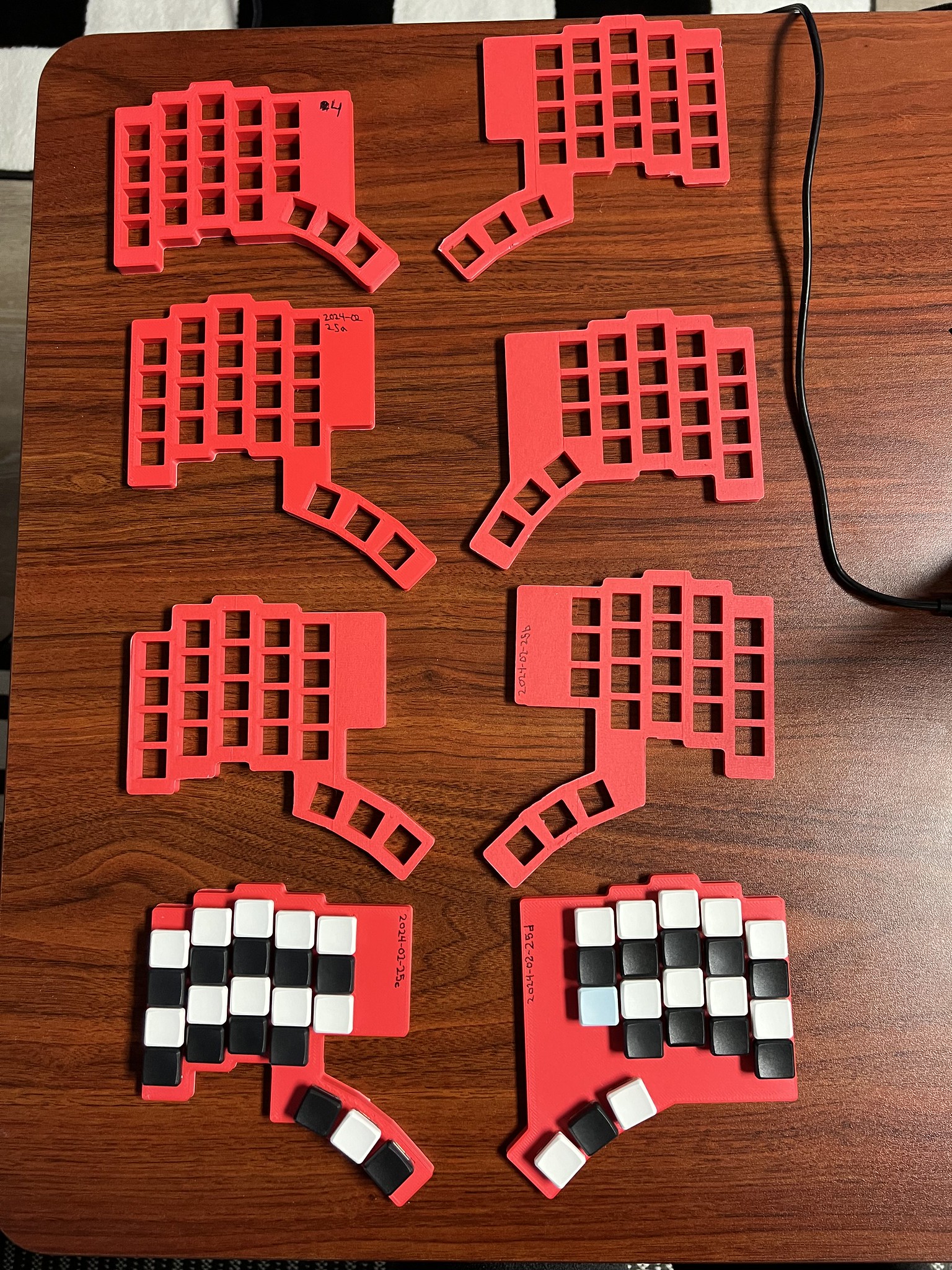 It's really fun to be able to layout the switches with some pretty simple yaml, then 3D print a mock-up that switches can be fit into and test out how it feels to type. Altogether I think I printed and did fit/layout testing across at least 6 iterations. The process consists of: