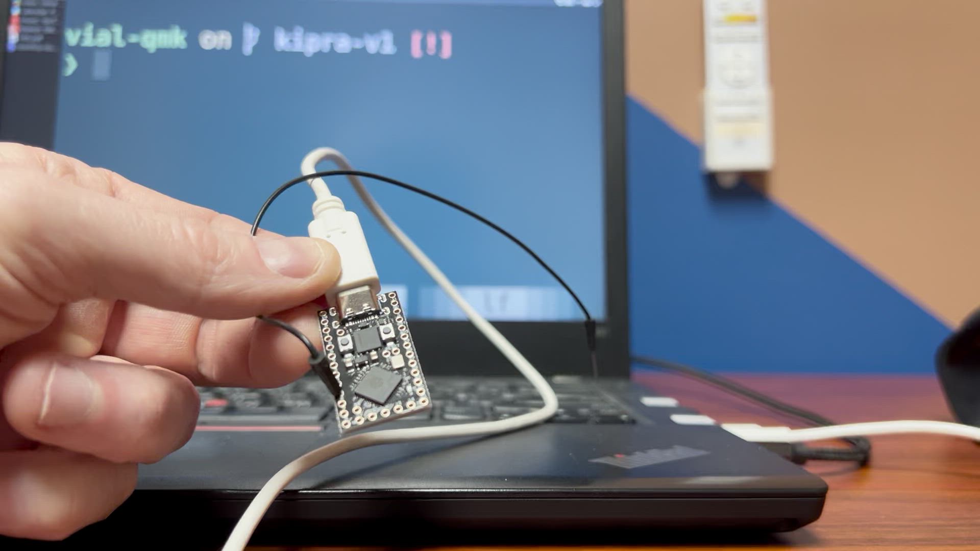 While waiting for PCB fabrication, I got a head start on configuring QMK firmware and flashing my RP2040 MCUs. My goal was to have this board supported in Vial which is a nice GUI that allows real-time changes to your keymap without reflashing. As per the Vial docs, I started by making sure I had a stock QMK firware compiling, flashing, and working as a keyboard. I confirmed this by just shorting a row hole to a column hole with a jumper wire and seeing a letter get typed.