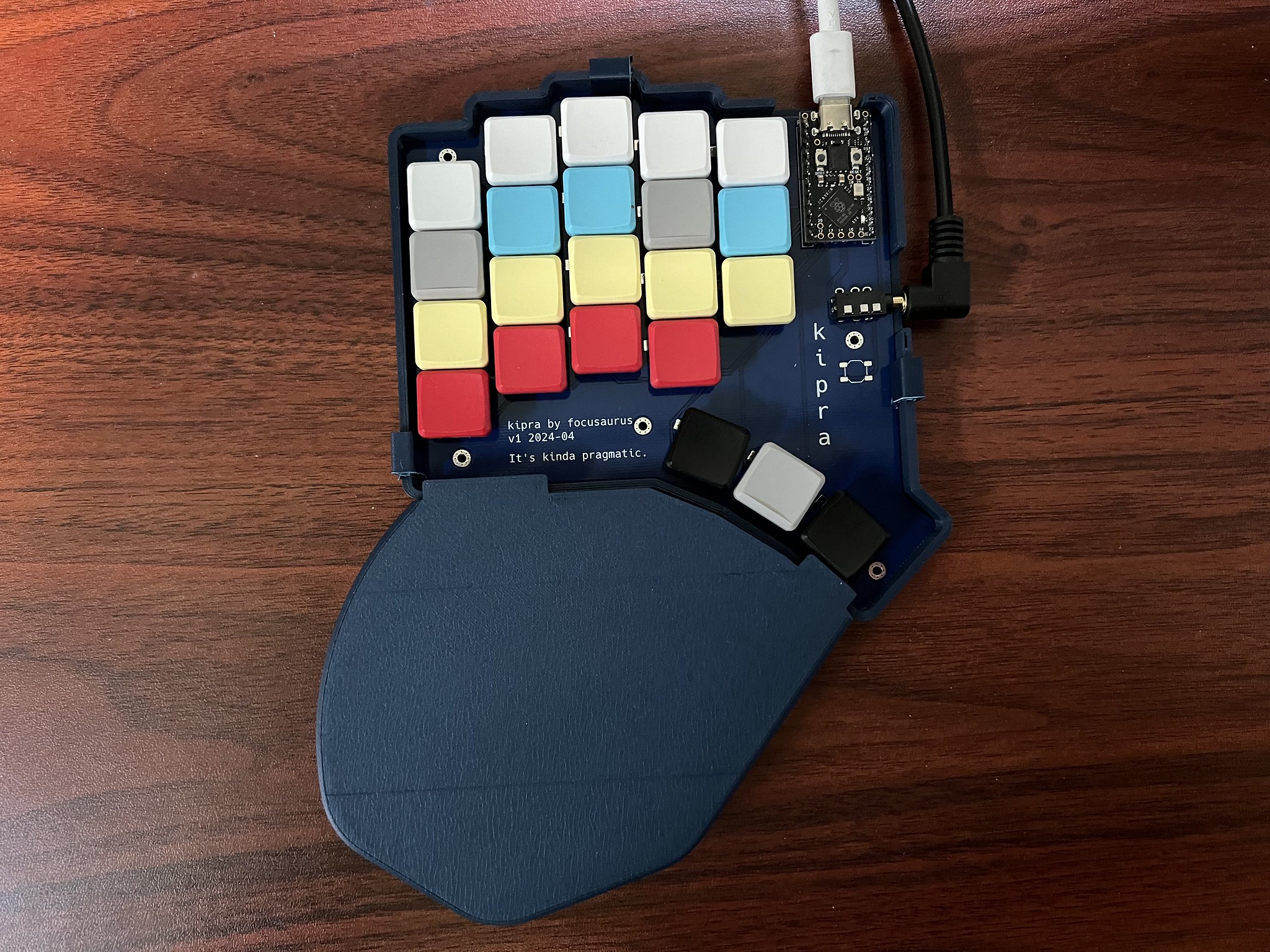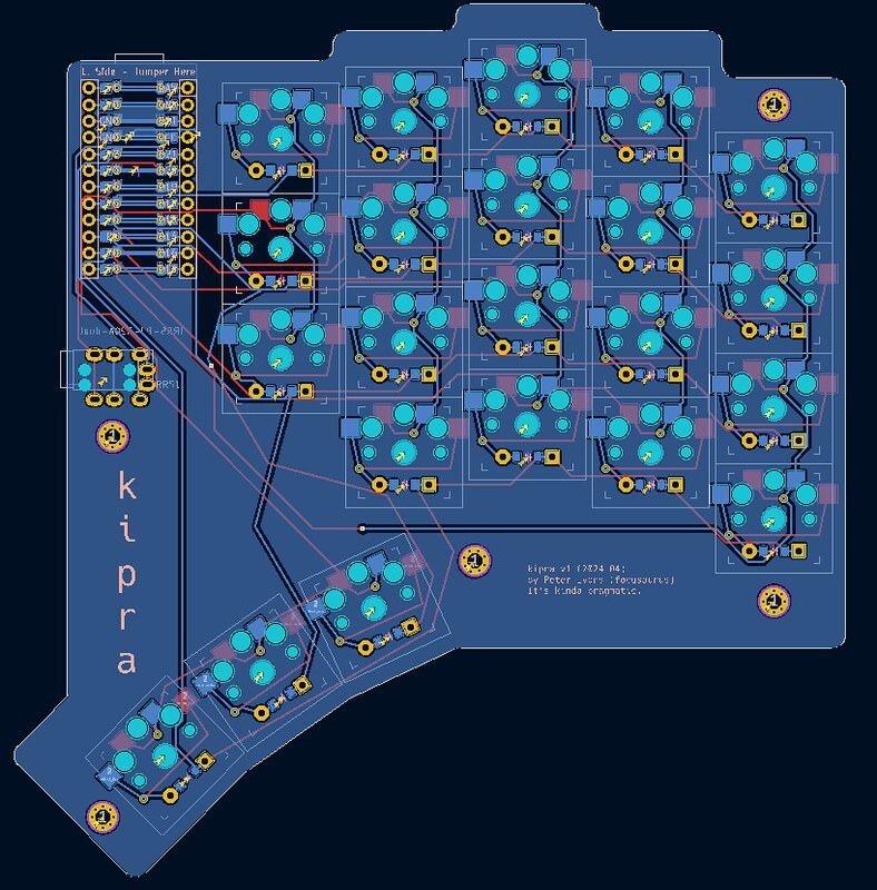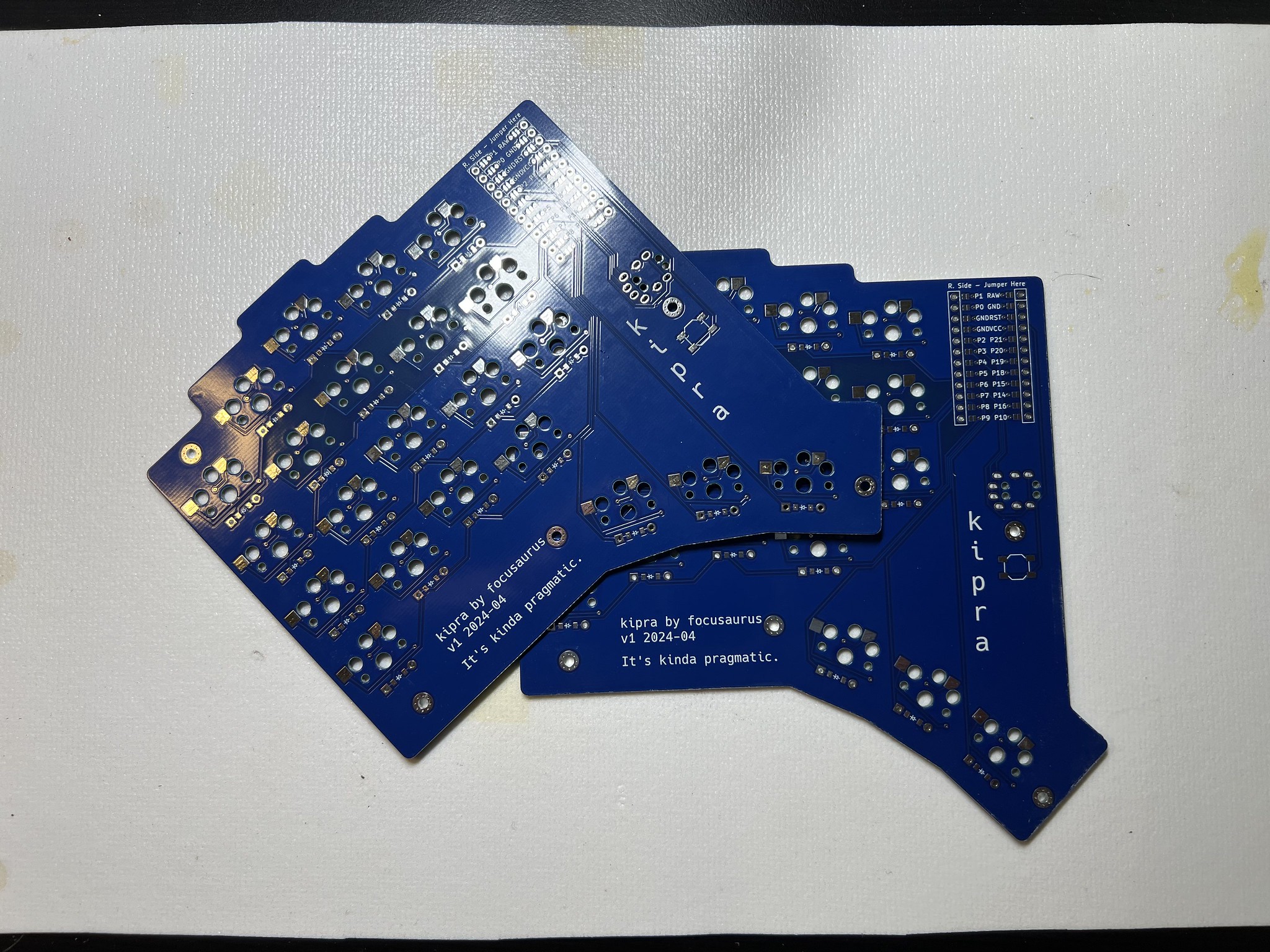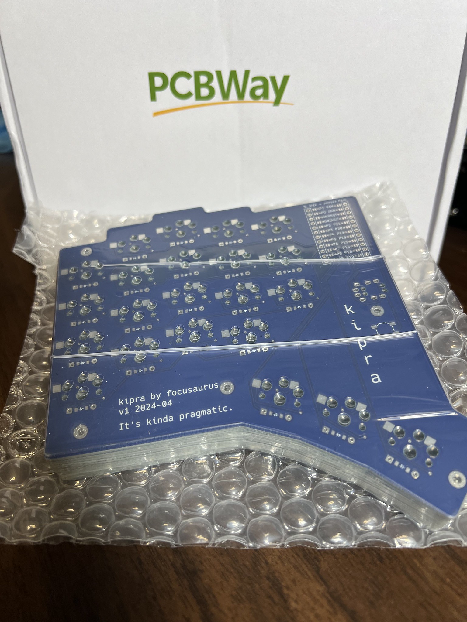 See focusaurus/kipra-keyboard on github for all the files you need for ergogen, kicad, freecad, and PCBWay if you want to make a variation of this.