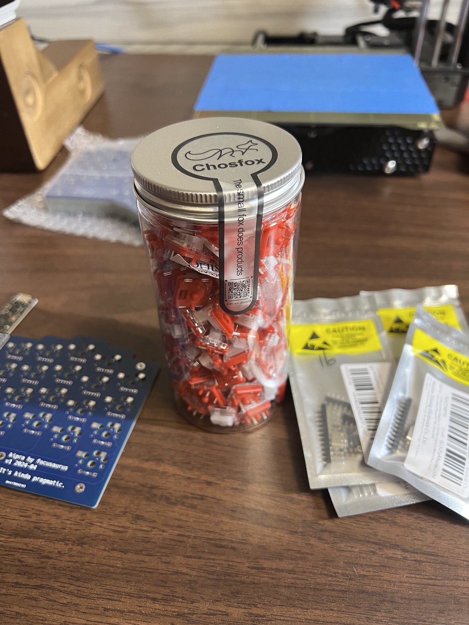 For these builds I ordered mostly enough choc pro red linear 35g switches to build 5 split keyboards. This was on April 5, 2024. On April 23, a brand new flavor of choc switches engineered to be silent went on sale for the first time over at lowprokb.ca. Of course I found out about this project just a few days after placing my order. Sad trombone.