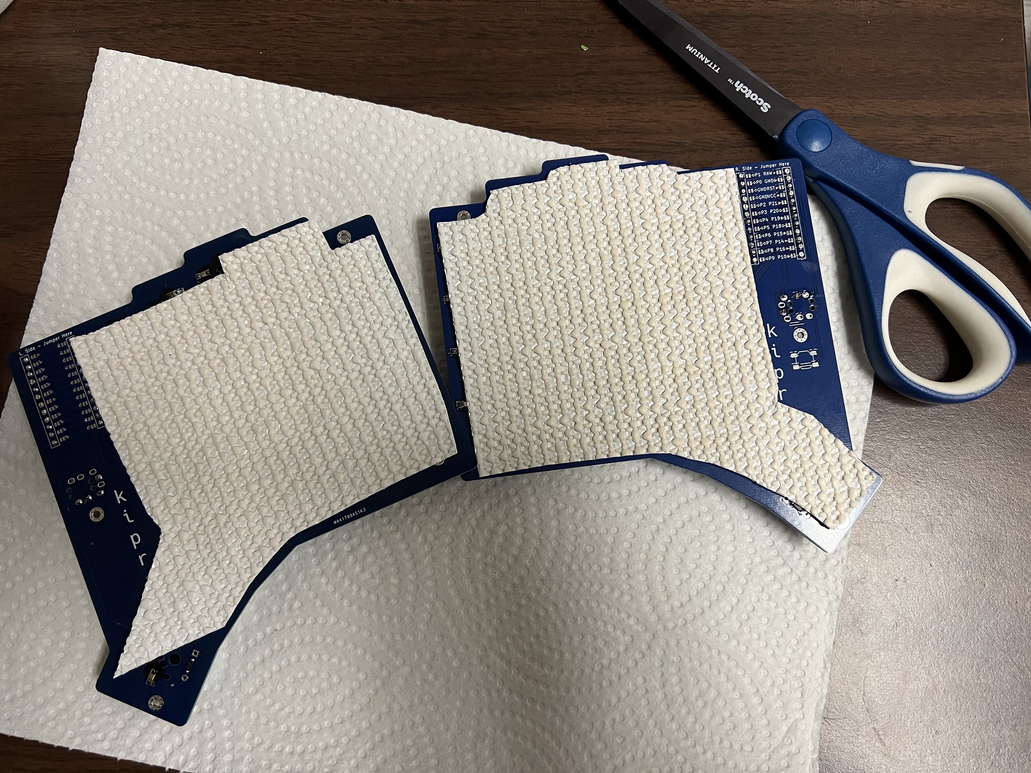 After a few days of trying some variations, I thought I might be able to get away without a case, and hopefully without a palm rest, by attaching some shelf liner material directly to the underside of the keyboard. I cut some scrap pieces we had lying around to roughly the right shape, spritzed the interior side lightly with water which the gorilla glue I used needs to activate, put the tiniest partial drop of glue I could manage in the center of each hotswap socket, placed them together, and left them weighted overnight for the glue to cure.
