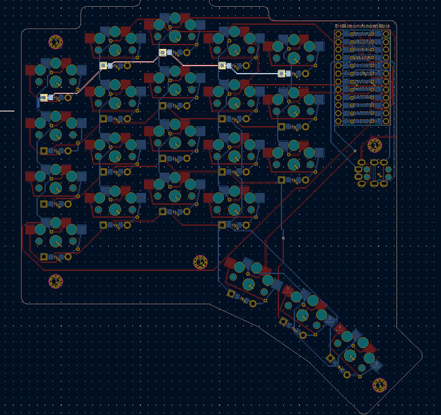 There's a tricky hand-off in the process where you've done all you can in ergogen and generated a KiCAD file which you then start to modify. If you discover any changes you want that require you to go back into ergogen, you'll need to re-do all the KiCAD work. So I put off routing traces for a while as I gradually ran out of tweaks to make in ergogen and started to get bored and keen to get on with the KiCAD bit.