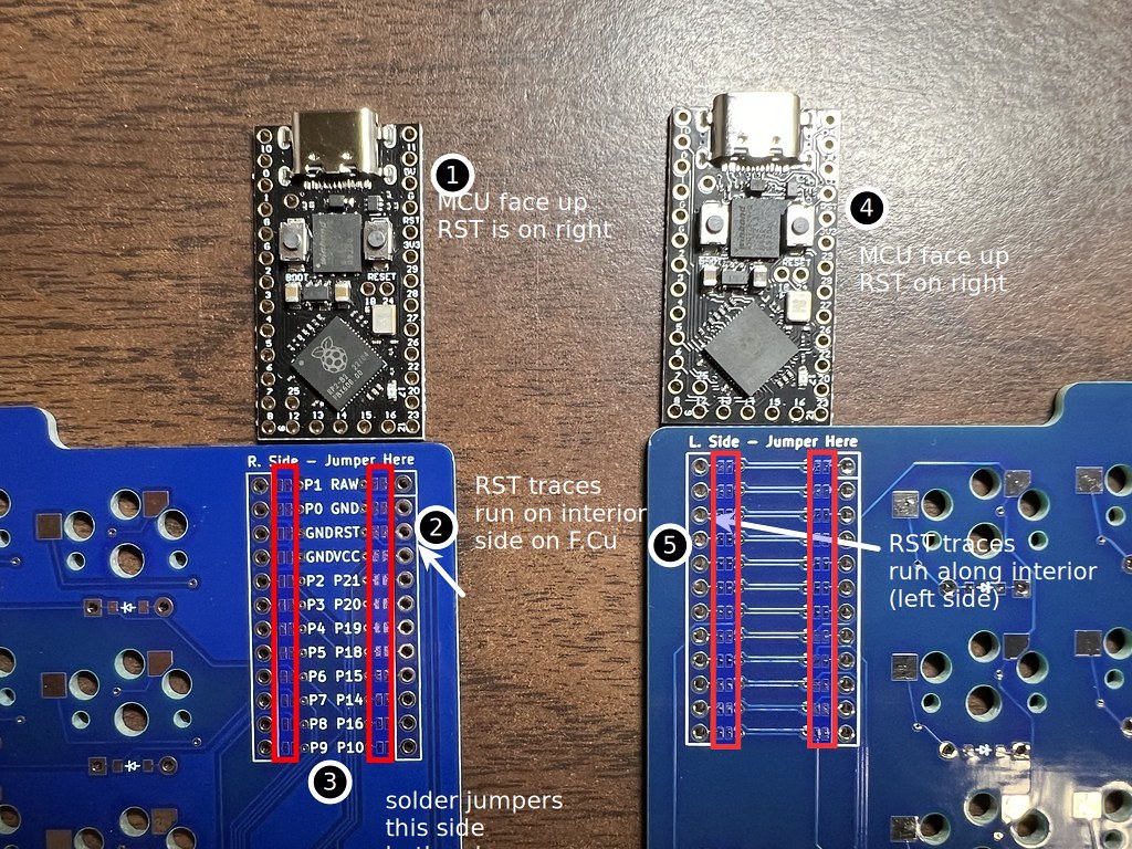 Mounting the MCU revealed that my MCU had one extra through hole per side compared to the footprint on my PCB. So I had to figure out if the extra empty hole was supposed to be the one closest to the USB connector or the one furthest away. I also had to snip one of my pin headers off to make it match the PCB footprint. I studied the pinout a bunch and tried to reason that reset should map to reset, etc, but it's tricky because my MCU footprint is reversible and has jumpers so everything is like "this is reset, unless you soldered one of these jumper pads, in which case it is no longer reset", but exactly how all that cleverness works out is really tricky to keep track of. This was extra fun because the microscopic hole labels on the MCU are mostly between the through holes and it's not clear if the label applies to the hole above or below the label, and even studying the ends of the row don't really clear it up. But in the end I was pretty sure I needed my rows and columns starting on the holes farthest from USB, so I mounted it that way, and it ended up being correct.